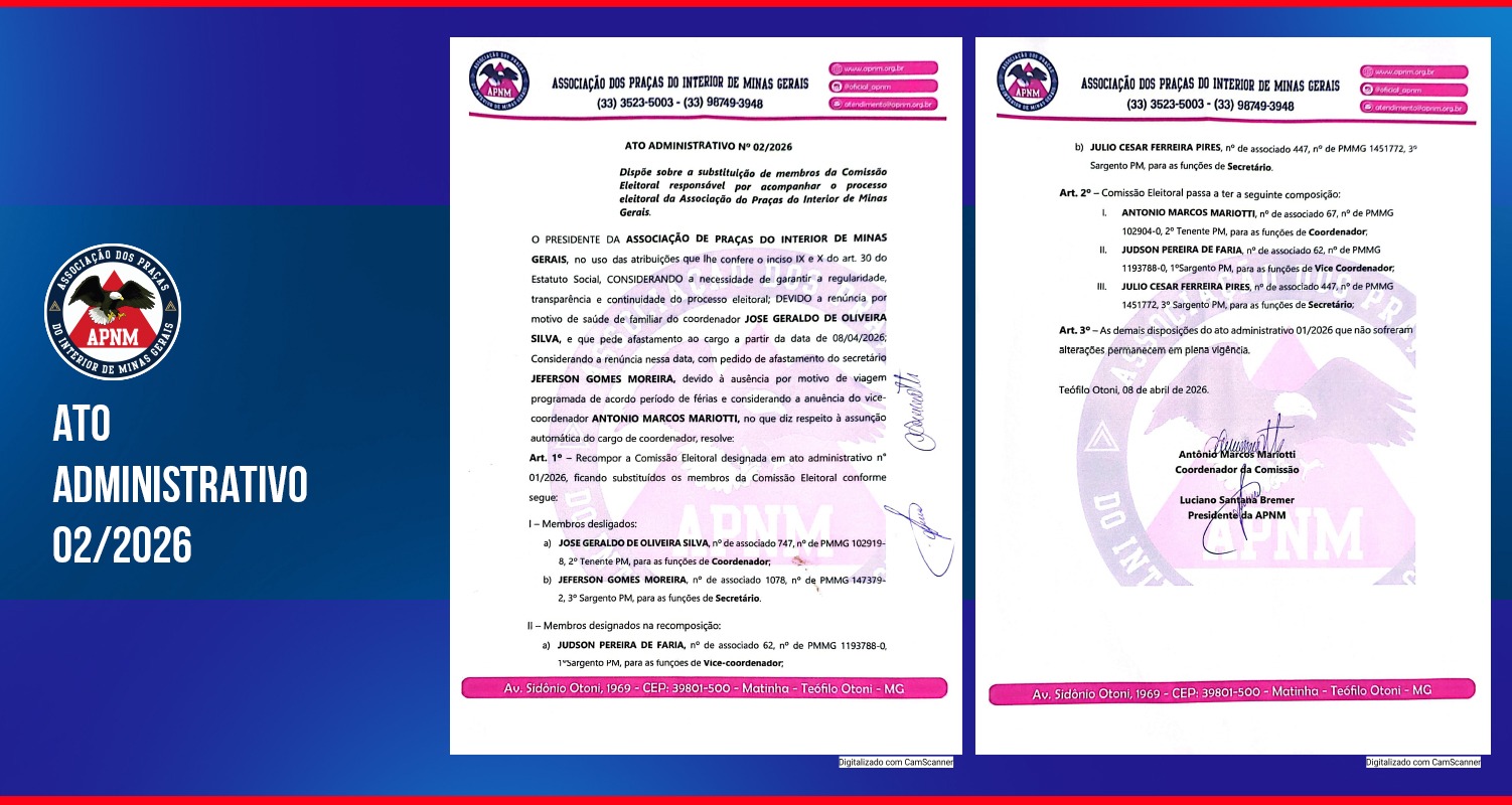 A Associação dos Praças do Interior de Minas Gerais (APNM) informa a publicação do Ato Administrativo nº 02/2026, que dispõe sobre a recomposição da Comissão Eleitoral, garantindo a continuidade, transparência e regularidade do processo eleitoral da entidade.